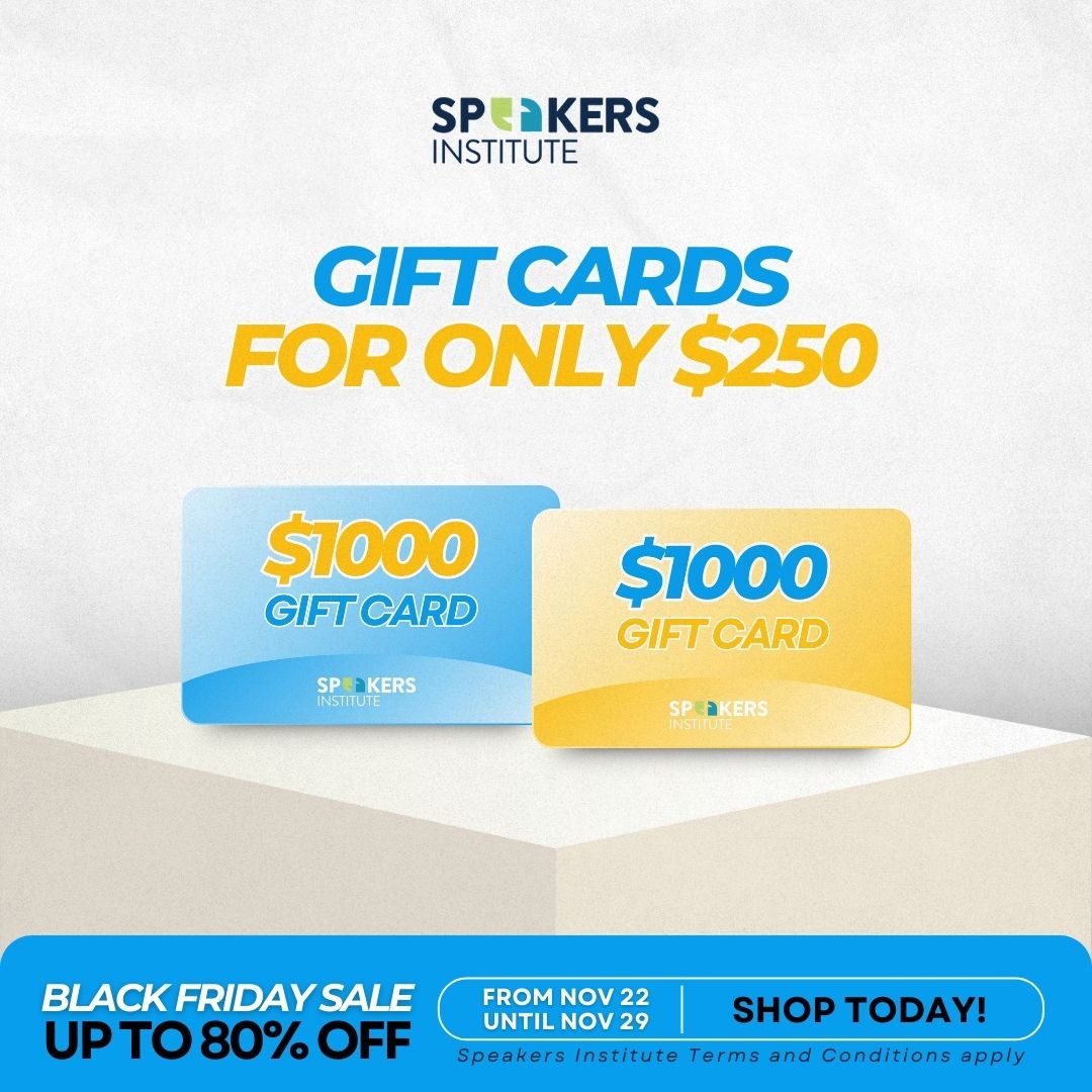 Surprise a loved one or invest in your future. Get a $1,000 gift card for just $250 and apply it to any Speakers Institute program. This offer makes it easy to give the gift of world-class training or keep it as a way to continue your own development journey.